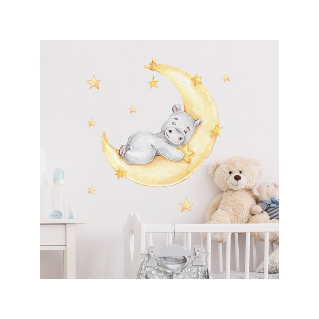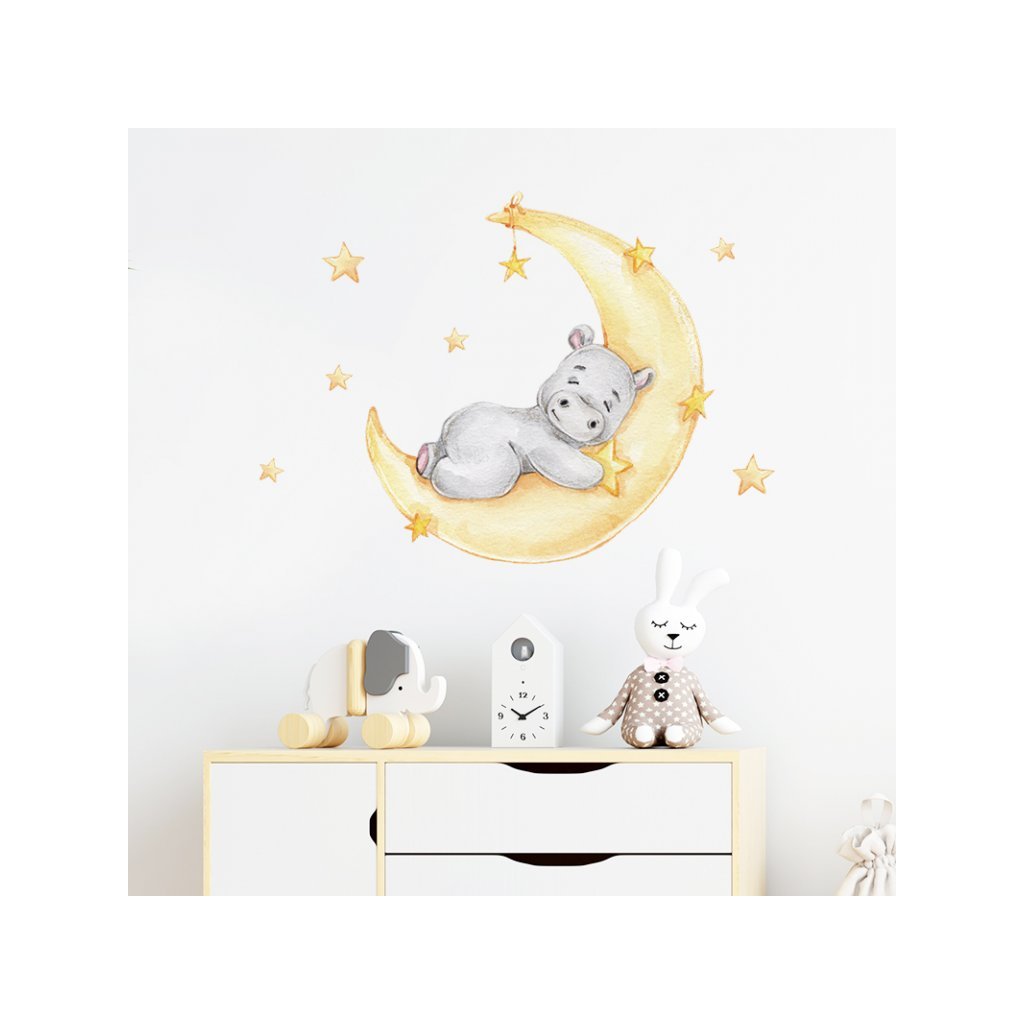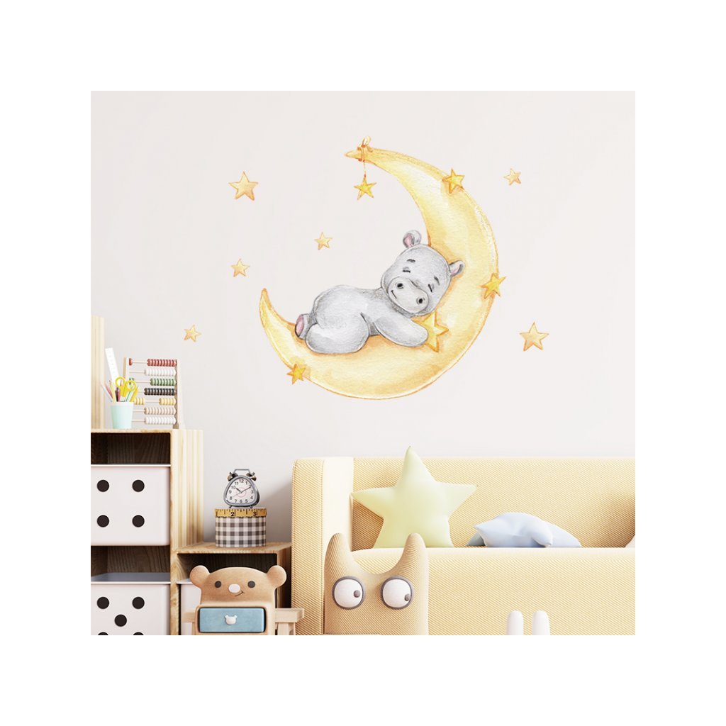 Táto originálna samolepiaca dekorácia na stenu Roztomilý hrošík sa bude krásne vynímať na stene každej detskej izby. Tento roztomilý hrošík spiaci na mesiačiku iste vykúzli úsmev na tvári každého dieťaťa. Pri pohľade na túto dekoráciu budú Vaše ratolesti spinkať behom sekundy.