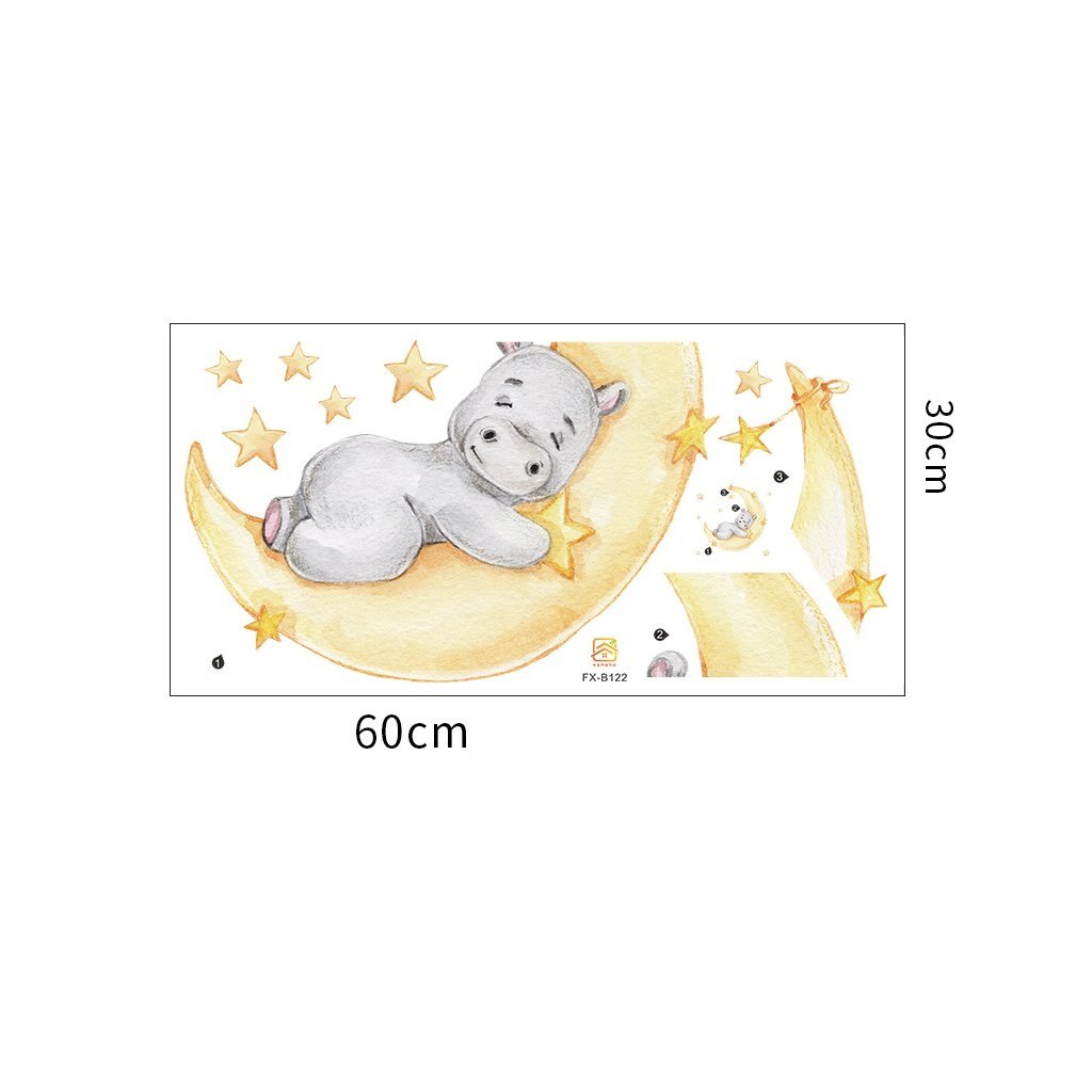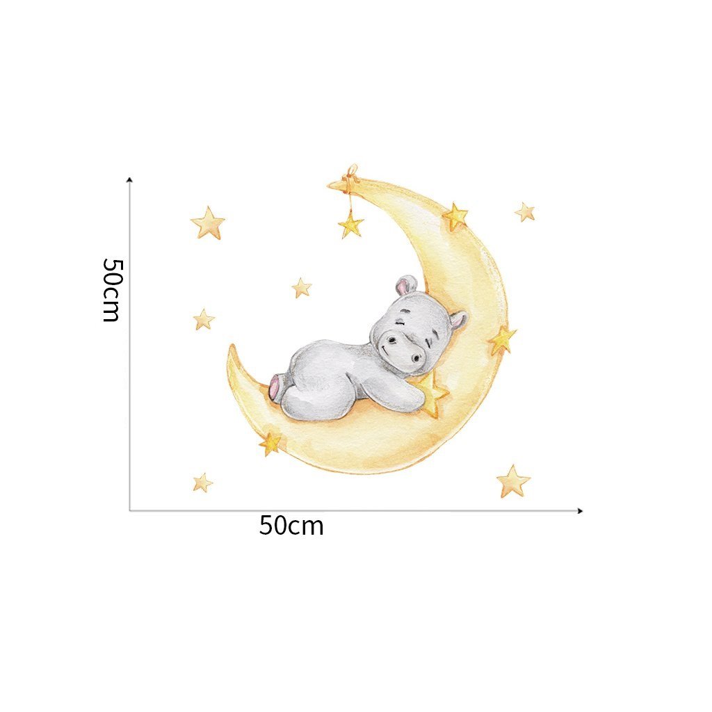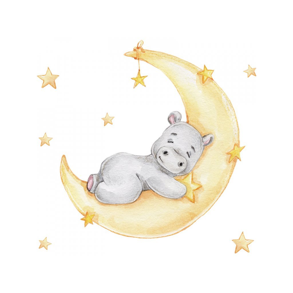 Táto originálna samolepiaca dekorácia na stenu Roztomilý hrošík sa bude krásne vynímať na stene každej detskej izby. Tento roztomilý hrošík spiaci na mesiačiku iste vykúzli úsmev na tvári každého dieťaťa. Pri pohľade na túto dekoráciu budú Vaše ratolesti spinkať behom sekundy.