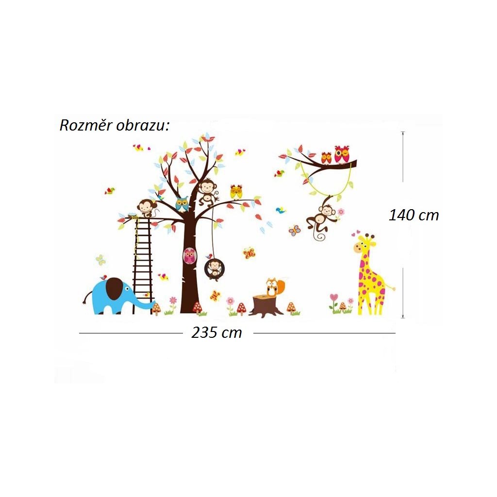 Veselá samolepiaca dekorácia na stenu s motívom detský Strom, na ktorom sa hrajú opičky a okolo je mnoho zvieratiek.