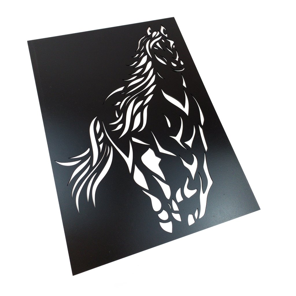 Vkusná nástenná drevená dekorácia Klusajúci kôň čierny s 3D efektom o veľkosti 67 x 44 cm.