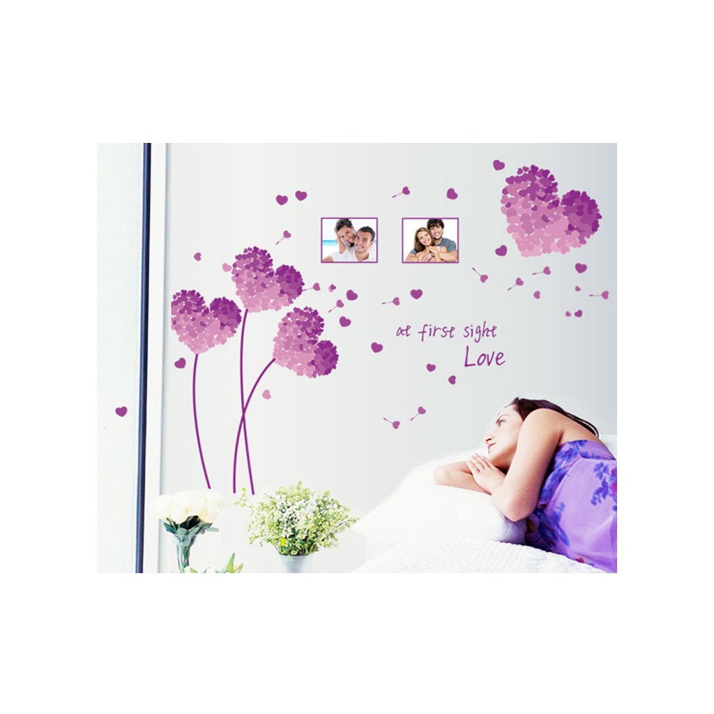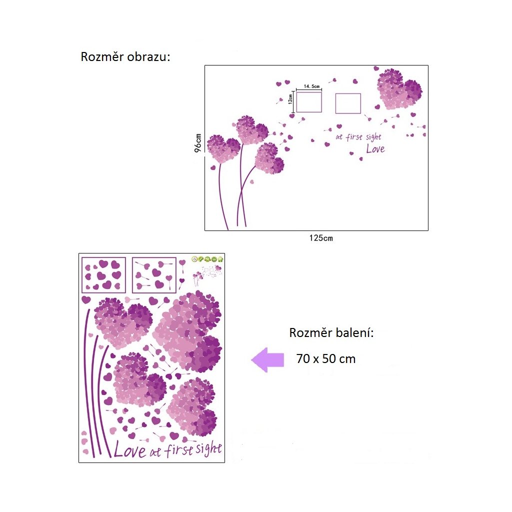 Roztomilá, farebná samolepka na stenu s motívom Fialových srdiečok spolu s dvomi rámčekami na fotky.