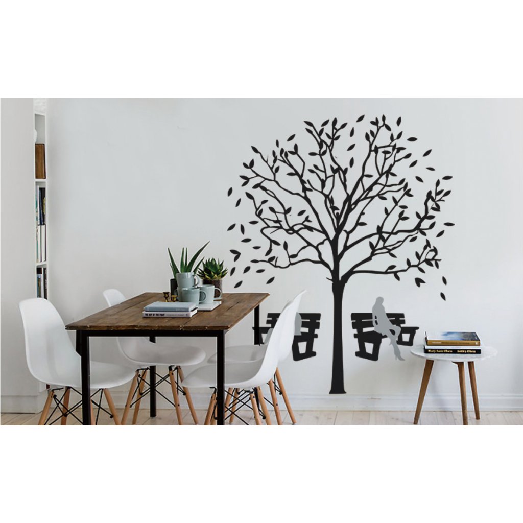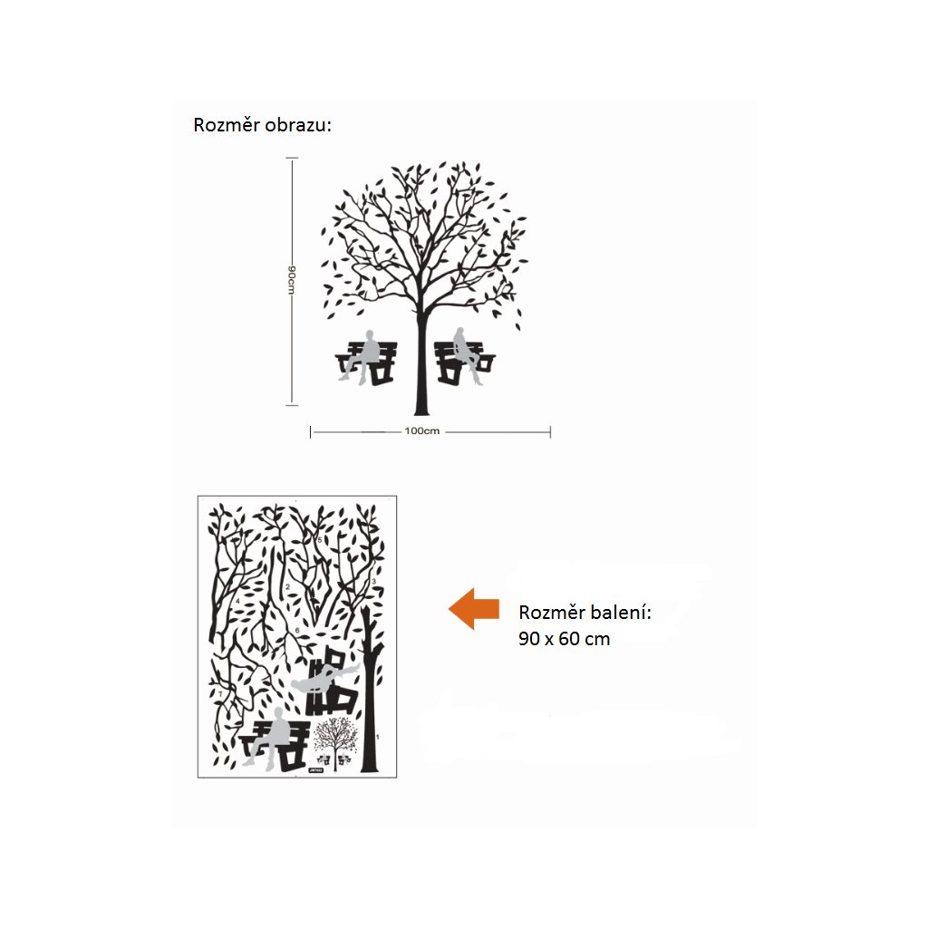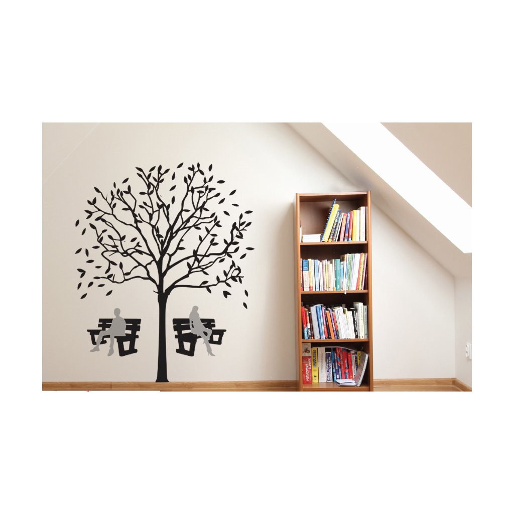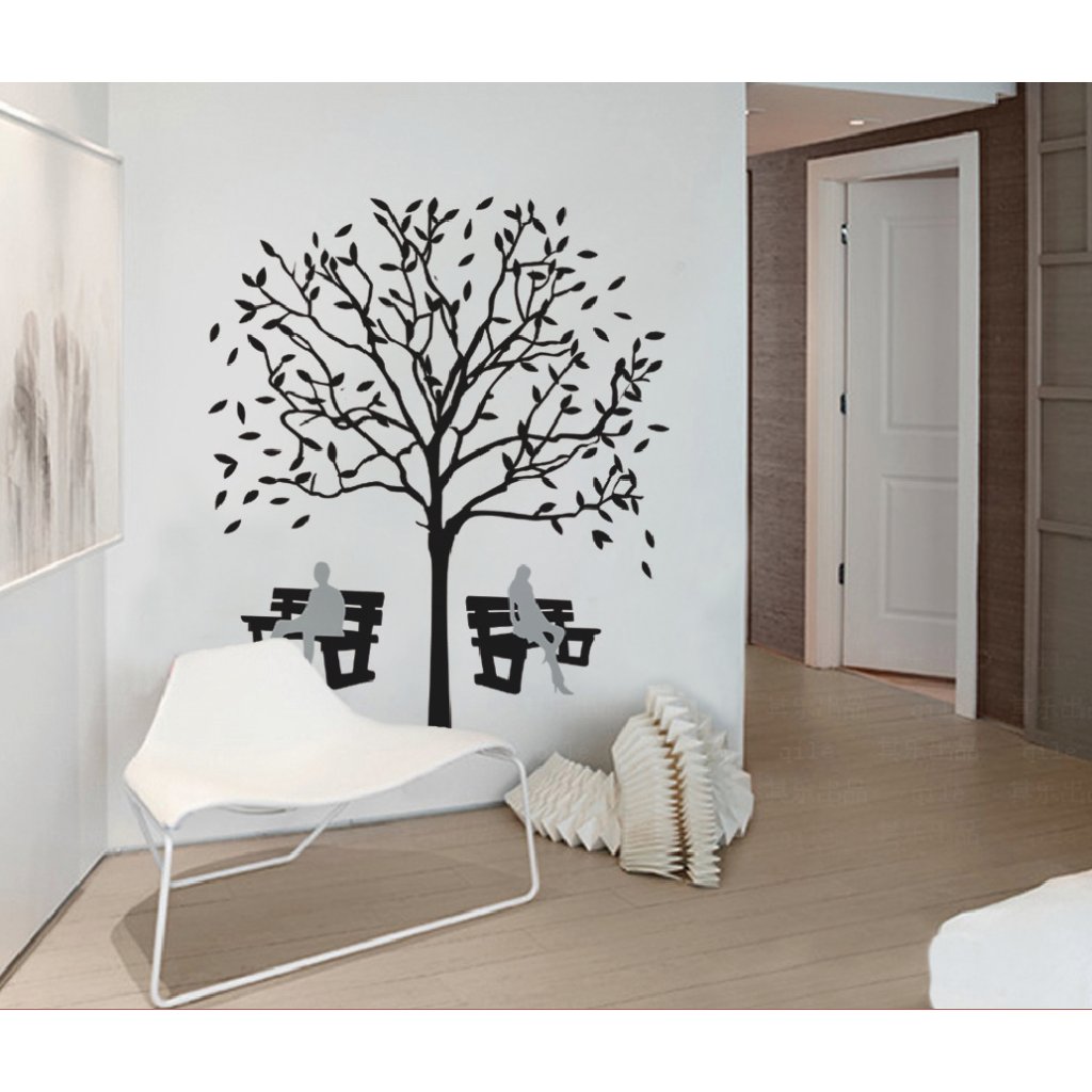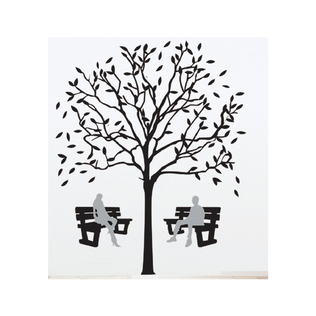 Efektná samolepka na stenu v modernom minimalistickom umeleckom štýle, zobrazujúca dve šedé siluety postáv sediaci na lavičkách pod korunami stromov.