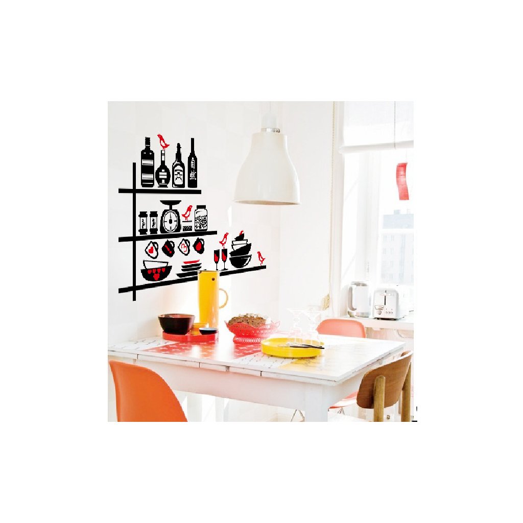 Efektná samolepka na stenu v modernom umeleckom štýle, zobrazujúca poličku s kuchynskými riadmi a doplnkami. Ozdobte si vašu domácnosť týmto originálnym motívom, ktorý ozdobí možno práve vašu kuchyňu.