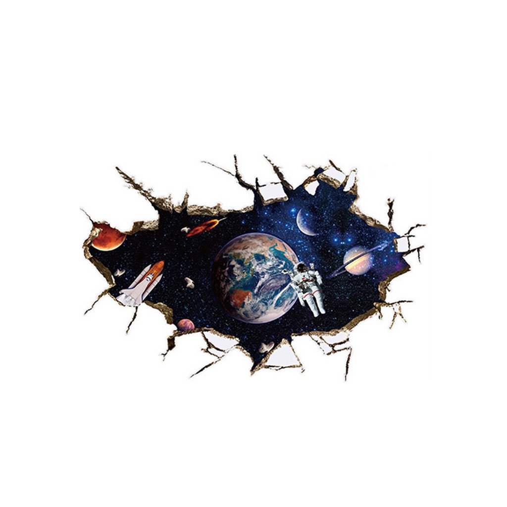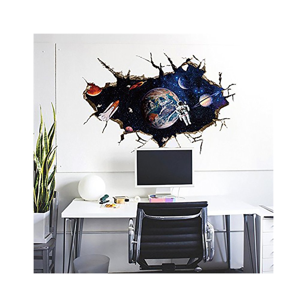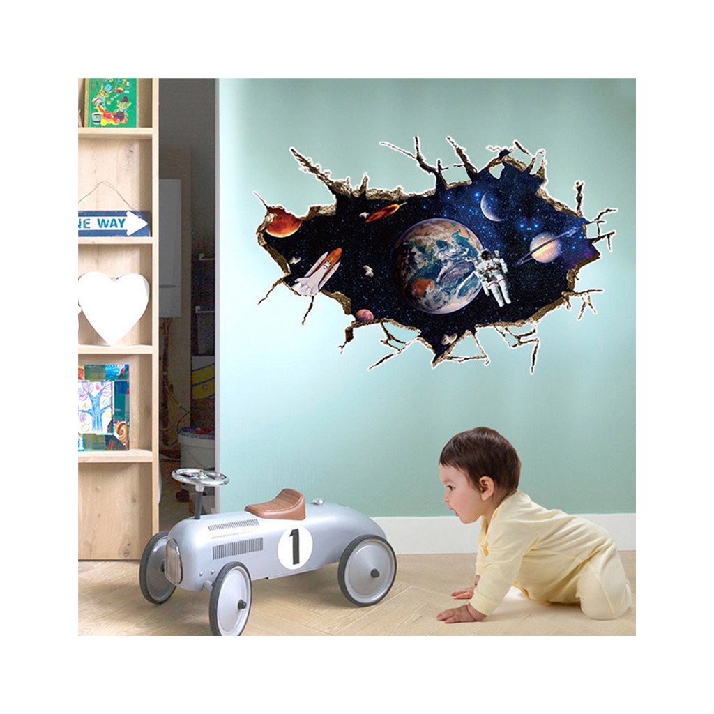 Efektná 3D samolepka v modernom štýle, znázorňujúca vesmír, v popredí raketoplán s kozmonautom a planétou Zem v pozadí. S touto dekoráciou ľahko navodíte dojem, že ste práve na vesmírnej stanici a môžete pozorovať dianie vo vesmíre.