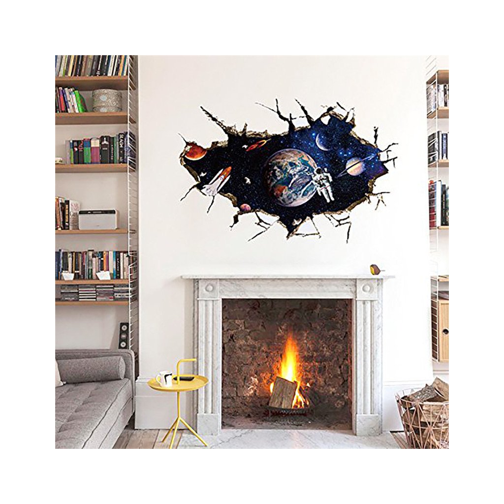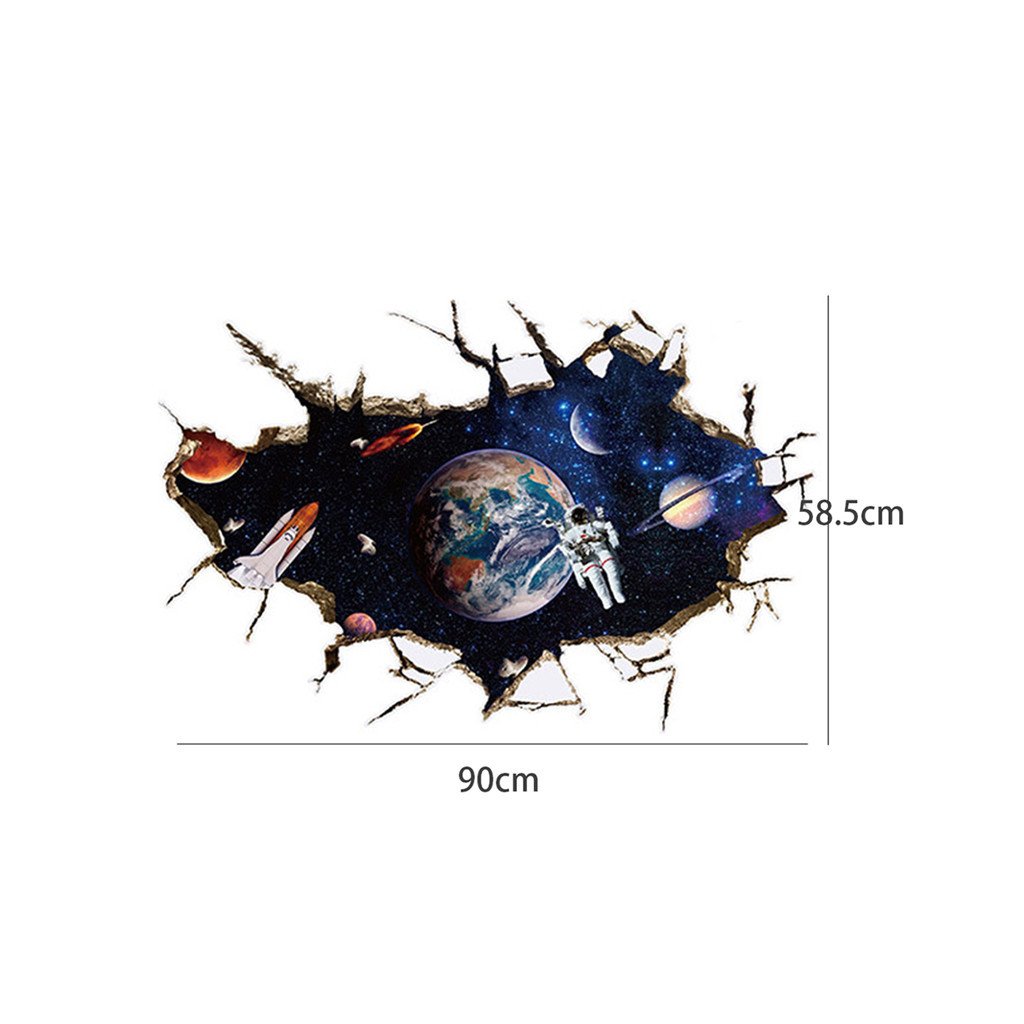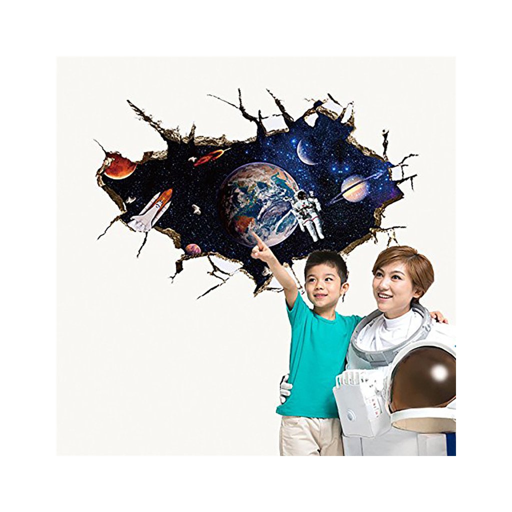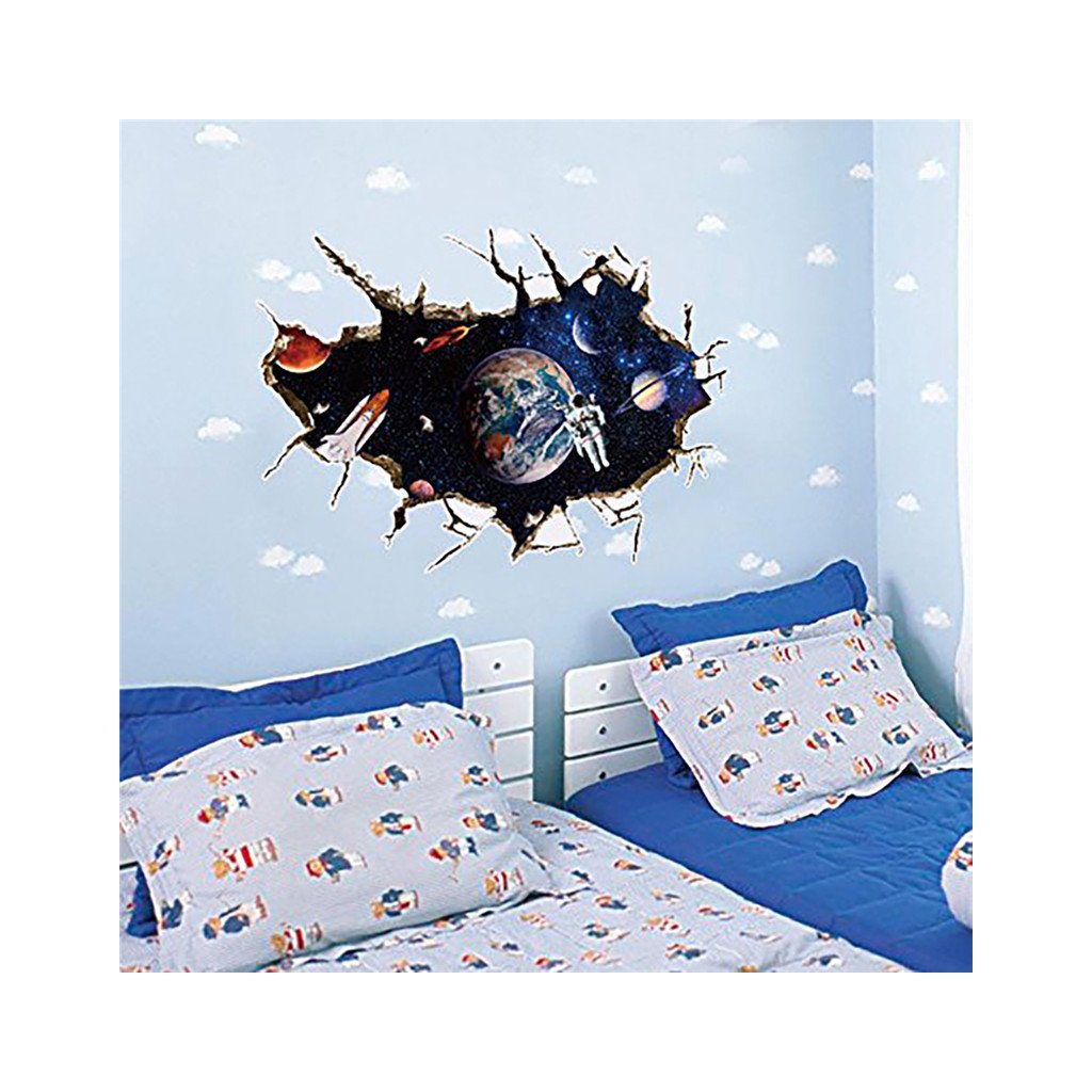 Efektná 3D samolepka v modernom štýle, znázorňujúca vesmír, v popredí raketoplán s kozmonautom a planétou Zem v pozadí. S touto dekoráciou ľahko navodíte dojem, že ste práve na vesmírnej stanici a môžete pozorovať dianie vo vesmíre.