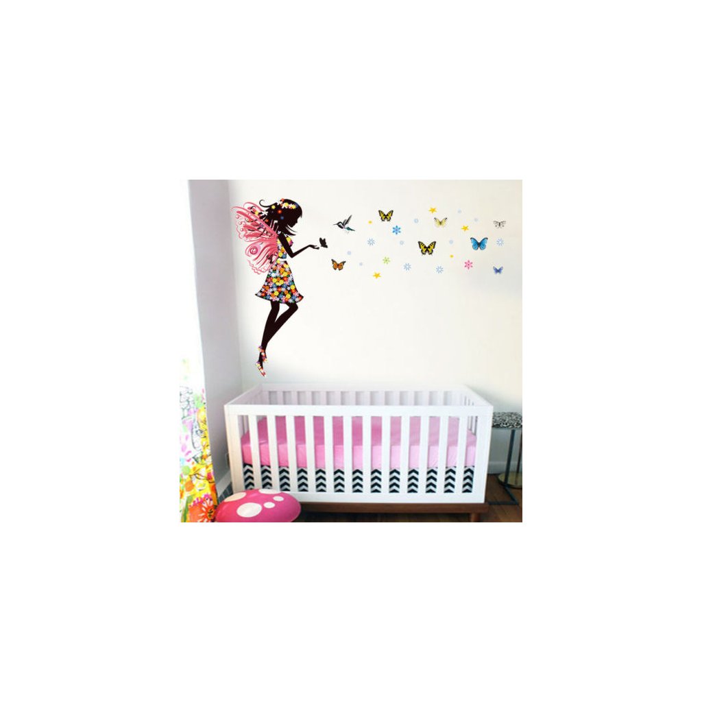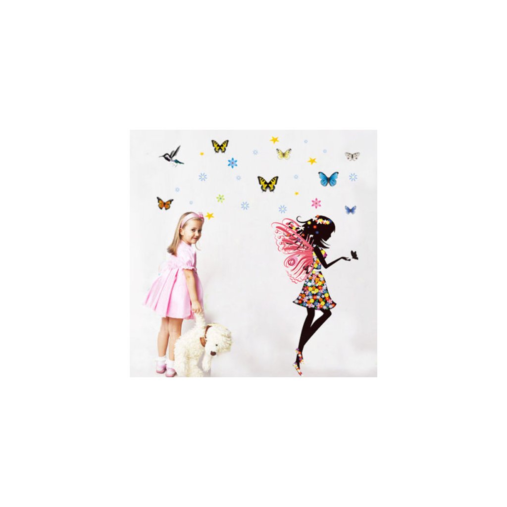 Roztomilá, farebná samolepka na stenu sediacej Víly s krídlami v kvetinových šatách obklopená motýlikmi.